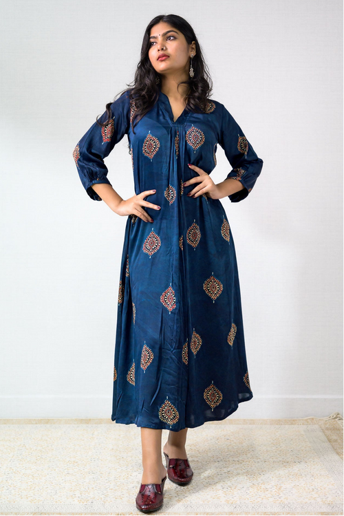 Ajrakh Blooms Cream Alia Cut Dress Ajrakh Blooms Cream Alia Cut Dress