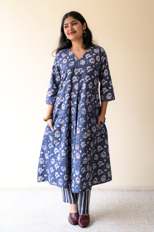 Set of 2- Blue Blooms Modal Ajrakh Short Top and Parallel Pants Set of 2- Blue Blooms Modal Ajrakh Short Top and Parallel Pants